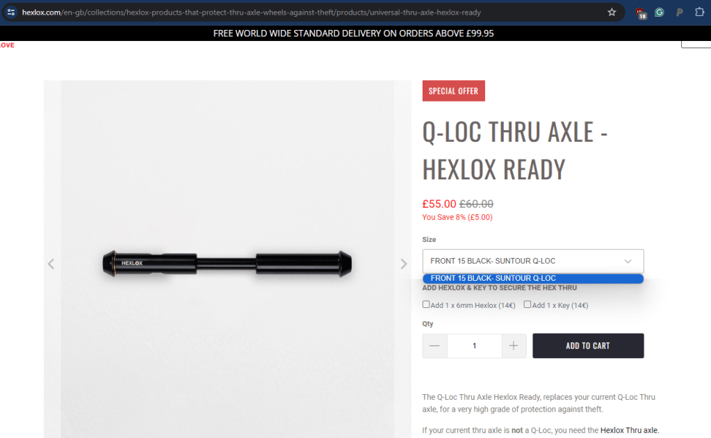 For my Suntour Raidon fork, I wanted the ‘Q-LOC THRU AXLE – HEXLOX READY,’ which I bought directly from the Hexlox website. Be sure to get the right product else it won’t work. For the Q-Loc axle, you’ve just got the one option, for the FRONT 15 BLACK-SUNTOUR Q-LOC version, which is what I use in the Raidon fork and it works great. Hexlox also make replacement thru-axles for other specifications such as on gravel bikes or other suspension fork brands, but for Suntour forks, you get a special Q-Loc replacement product. Just a shame that it’s expensive!