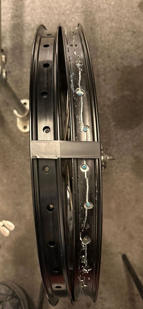 - Pay for a rear wheel rebuild using the best rim you can find. This will require paying for a new rim, spokes, and labour, and it will probably take a shop at least a week, during which time your bike is out of action. Broadly speaking, the best rims are ‘welded’ aluminium rather than ‘pinned’ or ‘sleeved’, and the wider the internal width and the back tyre (ideally a Schwalbe Pickup), the better. You could try using a quality 26-inch carbon rim, which may be more resistant to bending and cracking than an aluminium rim, but I don’t truthfully know if this will work